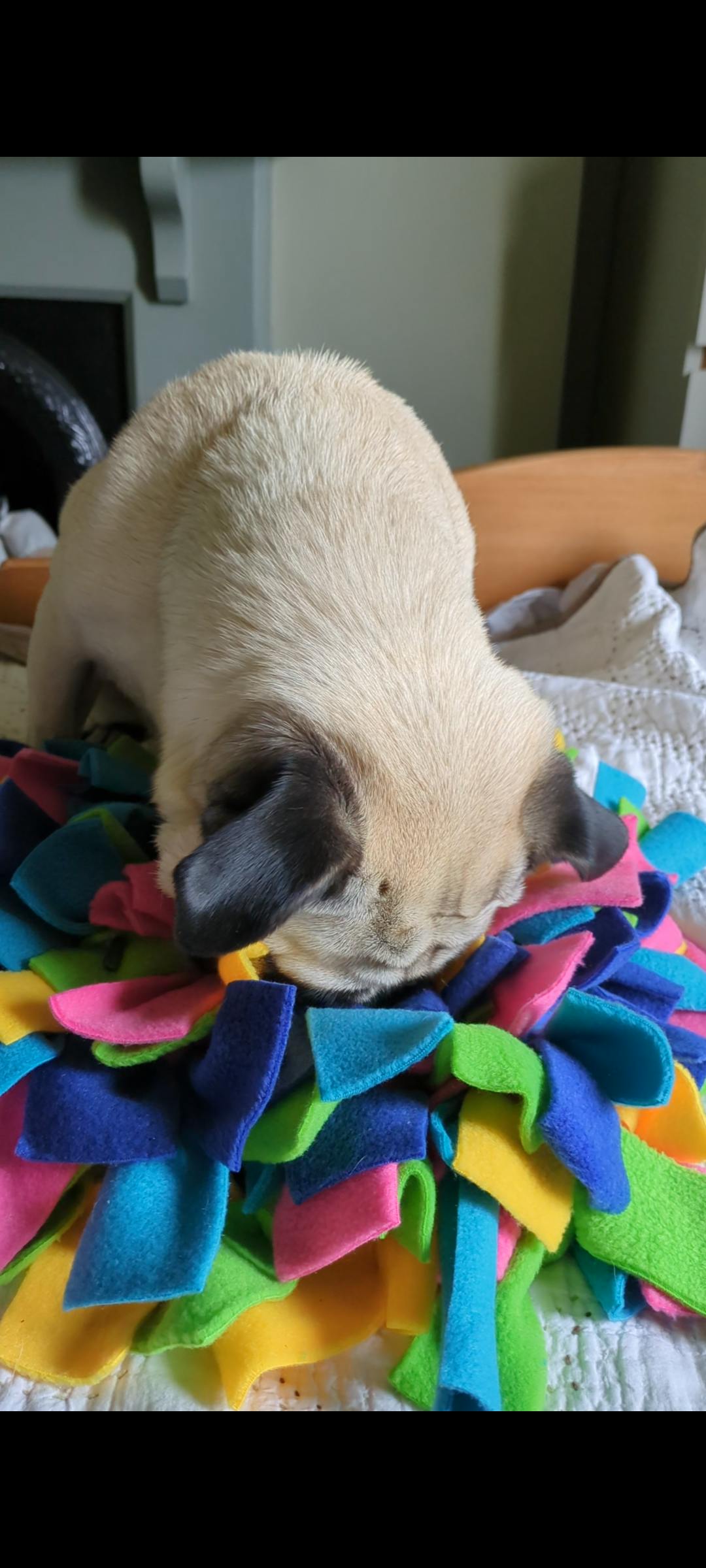 The Ruffle Snuffle® Magic mat is made in Yellow, Cerise, Blue or Purple, Lime and Turquoise. Occasionally we will substitute a colour for a similar one with a pattern depending on stock availability. ( eg Dark Blue with Stars may be used instead of Royal Blue or Purple).